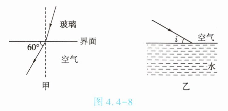 。一束光线由空气斜射入水中,如图4.4-8乙所示,当夹角i增大时,折射角将减小