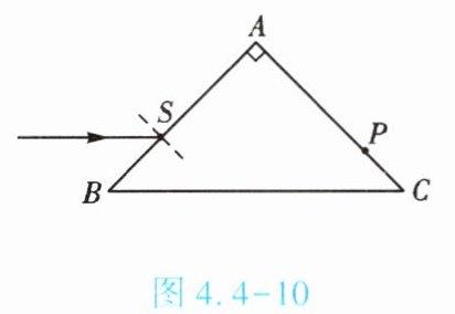 7. (★★★)如图4.4-10所示,一玻璃三棱镜的横截面为等腰直角三角形ABC。一束红光平行于BC边从S点射入三棱镜,经AB面折射后,又在BC面发生反射,然后恰好从P点折射后射出。请画出这个传播过程的光路图。