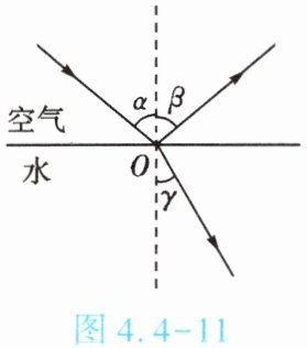 8. (★★★)某同学做“探究光的折射特点”的实验。如图4.4-11所示是光从空气射入水中的光路。实验中发现,折射光线、入射光线和法线在同一平面内,折射光线和入射光线分别位于法线两侧。通过实验还得到如下数据: