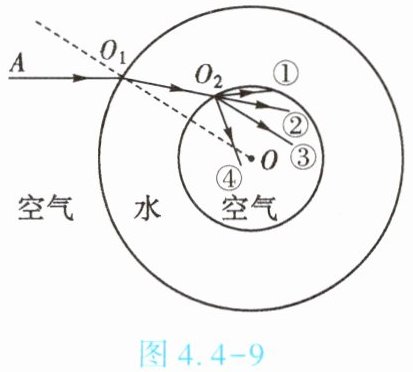 6. (★★)在天宫课堂中,航天员王亚平将空气注入水球,形成的气泡球与水球的球心都在O点。一束光线从空气射入水球的光路如图4.4-9所示,其中球心O与入射点$O_1$的连线为法线。则进入气泡球的折射光线可能为【