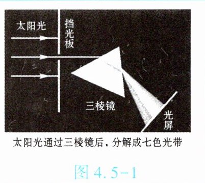 |光的色散|由图 4.5 - 1 所示实验可知,太阳光通过三棱镜后,会被分解成各种颜色的光,这是光的