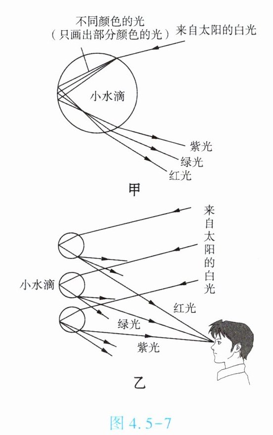 彩虹是一种大气现象,当空气中富集了大量的水汽,经过太阳光以较小的角度照射,阳光照射在水蒸气中的小水滴上会折射出七彩的色带,形成原理如图 4.5 - 7。