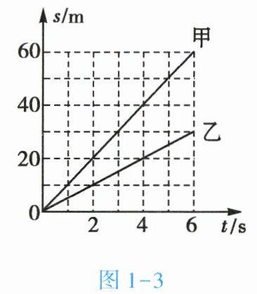 4. 有两辆车甲和乙,某时刻从同一路口同时向东匀速行驶。它们的路程随时间变化的图像如图 1 - 3 所示,则运行 2 min 后,甲车相对于乙车向