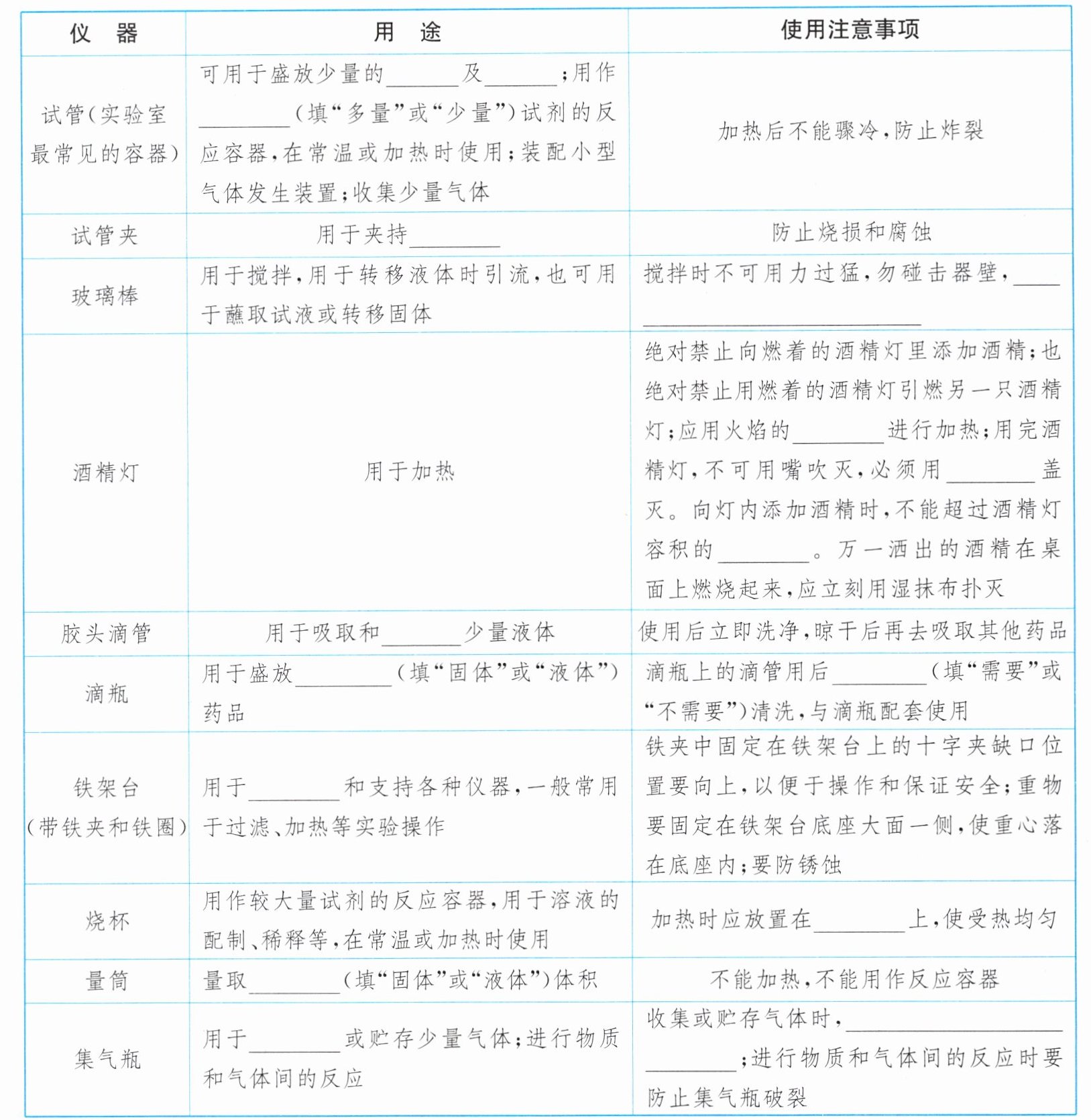 (从左到右,从上到下)固体 液体 少量 试管 防止玻璃棒或容器损坏 外焰 灯帽 $\frac{2}{3}$(或三分之二)滴加 液体 不需要 固定 陶土网 液体 收集 一般要用(毛)玻璃片遮盖