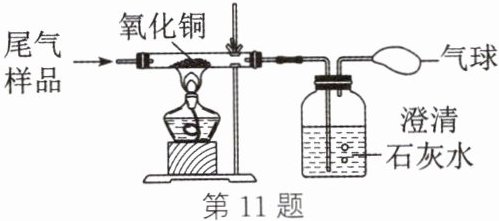 11. 某工业尾气中可能含有$ H_2、$CO 和$ CO_2 $中的一种或几种,为检验其成分,小明同学按如图装置进行实验,观察到黑色固体变红,澄清石灰水变浑浊。由此实验现象得出该工业尾气的组成情况可能有(