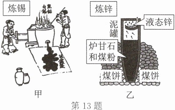 (2)明代《天工开物》描述了锡的冶炼方法,如图甲。炼锡时,原料锡砂中的$ SnO_2 $和木炭在高温条件下反应得到锡和二氧化碳,反应的化学方程式为