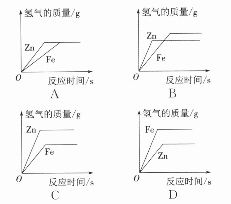 B 解析:锌比铁活泼,与稀硫酸反应时,锌比铁反应剧烈,产生气体的速率大。等质量的锌、铁分别与足量稀硫酸反应,铁生成的氢气比锌多,观察图像,描述正确的是B。