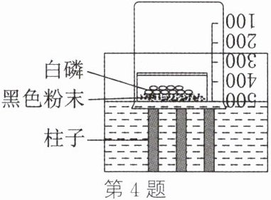 4. 在按书本装置做测定空气中氧气的含量的实验时,当装置内的氧气低于一定含量时,红磷就不再与氧气反应,从而导致测量结果偏小。有老师对该实验进行了改进,装置如图所示,在一容器中倒入刚拆封的“暖宝宝”黑色粉末,再在上面放足量的白磷,迅速扣上烧杯,随后白磷自燃,利用这一装置可更准确地测定空气中氧气的含量。
