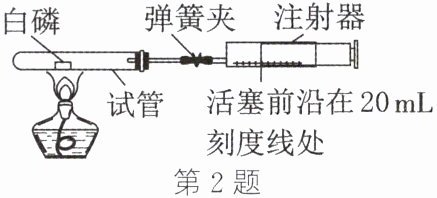 2. (2024·扬州高邮期中改编)为测定空气中氧气的含量,某化学兴趣小组将过量的白磷放入容积为40mL的试管中,用橡皮塞塞紧试管口,通过导管与容积为60mL且润滑性很好的注射器组成如图所示的实验装置进行实验。