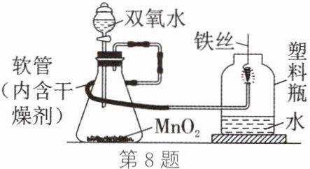 8. (1)如图是“铁丝在氧气中燃烧”实验的改进装置。实验时,打开分液漏斗活塞,通入干燥氧气约$10 s$,引燃铁丝下端的火柴,伸入塑料瓶内,并对准玻璃管口正上方,观察到的现象是铁丝剧烈燃烧,