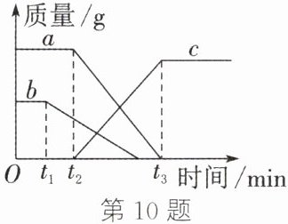 C 解析:在加热的条件下,高锰酸钾首先分解产生氧气,所以曲线a代表氯酸钾,曲线b代表高锰酸钾,A不符合题意;从图像上可以看出,反应的氯酸钾的质量大于高锰酸钾的质量,B不符合题意;t₁min时高锰酸钾开始分解生成氧气,氧气从t₁min时就开始产生,曲线c是从t₂min时开始变化,应表示氯酸钾分解生成的氯化钾的质量随时间的变化曲线,C符合题意;高锰酸钾在反应前后质量减小,直至完全反应,且其发生了分解反应并生成固体物质,高锰酸钾不再保持原有的化学性质,所以高锰酸钾不是氯酸钾分解的催化剂,D不符合题意。