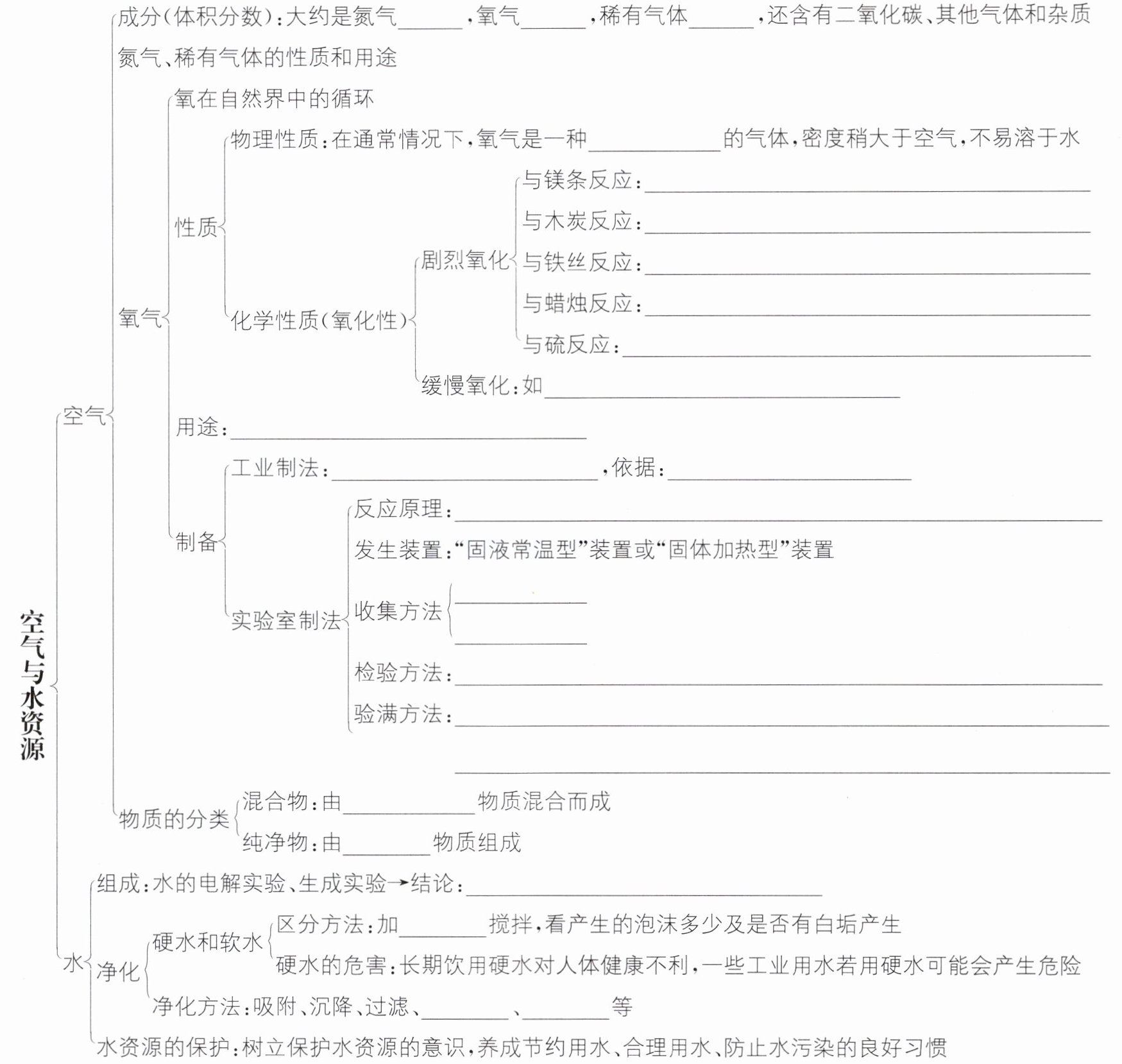 78% 21% 0.94% 无色、无气味 镁+氧气$\xrightarrow{点燃}$氧化镁 碳+氧气$\xrightarrow{点燃}$二氧化碳 铁+氧气$\xrightarrow{点燃}$四氧化三铁 石蜡+氧气$\xrightarrow{点燃}$二氧化碳+水 硫+氧气$\xrightarrow{点燃}$二氧化硫 动植物的新陈代谢、食物的腐烂等 作助燃剂、供给生物体呼吸和用于炼钢等 分离液态空气法(一般) 氧气和氮气的沸点不同 ${H_2O_2}\xrightarrow{{MnO_2}}{H_2O}+{O_2}$;${KMnO_4}\xrightarrow{加热}{K_2MnO_4}+{MnO_2}+{O_2}$;${KClO_3}\xrightarrow[加热]{{MnO_2}}{KCl}+{O_2}$ 排水法 向上排空气法 将带火星的木条伸入集气瓶中,若木条复燃,证明是${O_2}$ 向上排空气法:将带火星的木条置于集气瓶口,若木条复燃,则氧气已集满;排水法:若集气瓶口有气泡逸出,则氧气已集满 两种或两种以上 一种 水是由氢元素和氧元素组成的 肥皂水 蒸馏 煮沸