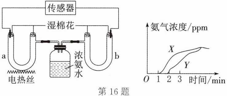 16. (创新实验)某同学为了探究微观粒子的性质,按图示进行实验,并借助传感器画出U形管a、b中氨气浓度随时间变化的曲线,下列关于该实验的说法中不正确的是(