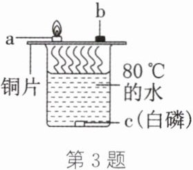 C 解析:白磷、红磷的着火点分别为40℃、240℃,a处物质能燃烧,a处物质为白磷,故选项A的说法正确;b处物质没有燃烧,b处物质是红磷,红磷与氧气接触,但没有燃烧,说明红磷的着火点高于80℃,故选项B的说法正确;铜片上的白磷燃烧,红磷不燃烧,说明燃烧需要温度达到可燃物的着火点,故选项C的说法错误;c处通入氧气,已满足燃烧的三个条件,水中的白磷能燃烧,故选项D的说法正确。