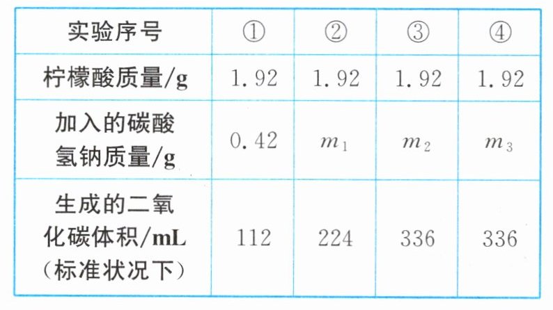 5. (2023·无锡)柠檬酸 $ (C_{6}H_{8}O_{7}) $ 能与碳酸氢钠反应生成二氧化碳。向 4 份等质量、等浓度的柠檬酸溶液中分别加入一定质量的碳酸氢钠,充分反应,4 次实验数据记录如表: