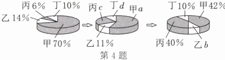 4. 在密闭容器中有甲、乙、丙、丁四种物质,在一定条件下使之发生化学反应,测得反应前及反应过程中的两个时刻各物质的质量分数如图所示,a、b、c、d分别表示相应物质的质量分数。下列数据正确的是(