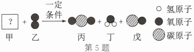5. (2023·随州)纯净物甲是一种绿色能源,其相对分子质量为46。在一定条件下,一定质量的甲与8.0g乙恰好完全反应,生成4.4g丙、5.4g丁和2.8g戊。反应的微观示意图如图,下列有关说法错误的是(