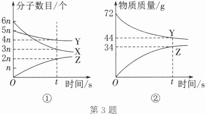 C 解析:由图①可知,X和Y是反应物,Z是生成物,根据反应前后分子数目的变化情况,该反应可表示为3X+Y=2Z,该反应属于化合反应,因此生成物Z一定是化合物,A的说法正确;由图②可知,t min时,参加反应的Y的质量为72 g-44 g=28 g,生成Z的质量为34 g,由质量守恒定律可知,参加反应的X的质量为34 g-28 g=6 g,则参加反应的X与Y的质量比为6 g:28 g=3:14,B的说法正确;由反应的化学方程式3X+Y=2Z可知,反应前后分子总数发生改变,C的说法错误;设Y、Z的相对分子质量分别为p、q,则$\frac{p}{2q}=\frac{28\ g}{34\ g}$,解得$\frac{p}{q}=\frac{28}{17}$,D的说法正确。