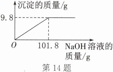 14. (2023·牡丹江改编)兴趣小组同学做了氢氧化钠溶液和硫酸铜溶液反应的定量实验。向192g硫酸铜溶液中逐滴加入氢氧化钠溶液,所加氢氧化钠溶液的质量与生成沉淀的质量关系如图所示,生成的硫酸钠全部溶解。