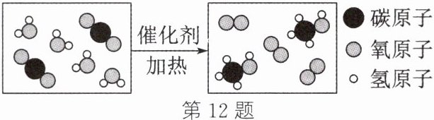 12. (2024·宿迁改编)二氧化碳的捕集与综合利用是实现“碳中和”的重要途径。捕集工业废气中的$\mathrm{CO_2}并与\mathrm{H_2O}$反应制甲醇(化学式为$\mathrm{CH_3OH}$)的微观示意图如图。下列说法错误的是 (