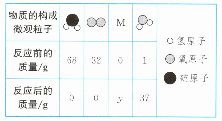 D 解析:根据质量守恒定律,反应前各物质的总质量等于反应后各物质的总质量,即:68+32+1=y+37,解得y=64,故 A 的判断错误;反应前物质 M 的质量为 0 g,反应后质量变为 64 g,根据催化剂在反应前后质量和化学性质不变可知,M 不是该反应的催化剂,故 B 的判断错误;由表中数据可知,参加反应的是 H₂S 和 O₂,生成物为 M 和H₂O,参加反应的硫元素质量为 68 g×(32/(32+2)×100%)=64 g,且反应后 M 的质量为 64 g,则 M 为硫单质;反应前硫化氢里的硫元素是-2 价,反应后 M 是硫单质,硫元素的化合价是 0,化合价发生了变化,故 C 的判断错误;设反应物硫化氢、氧气的化学计量数之比为 m:n,则有 34m/32n=68 g/32 g,m:n=2:1,故 D 的判断正确。