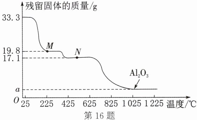 16. (2023·泰州改编)硫酸铝固体分解得到的活性$\mathrm{Al_2O_3}$可作为工业催化剂载体。取33.3 g $\mathrm{Al_2(SO_4)_3·18H_2O}$于坩埚内,隔绝空气灼烧。在热分解过程中,热重分析仪记录的数据如图(已去除坩埚的质量),已知425℃前减少的均为结晶水的质量。下列说法正确的是 (