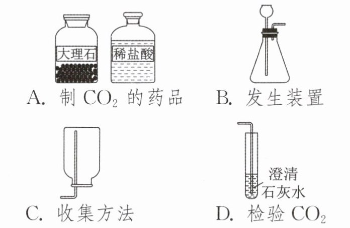 1. (教材P154练习与实践第2题变式)下列关于$CO_2$的实验室制取及检验的药品或装置不正确的是(