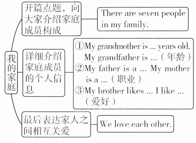 (1)说明文;一般现在时;第一人称为主 One possible version:Hello, I'm Han Lin. I'm 13 years old. There are seven people in my family. They are my grandparents, my parents, my elder sister, my younger brother and me. My grandmother is 75 years old. My grandfather is 77 years old. They like exercising. They do exercise every day. My father is a driver. He goes to work early every morning, and comes back home late. He likes playing ping-pong. My mother is a worker. She is busy too. She likes reading very much. My brother is 15 years old. My sister is two years older than him. She likes singing. My brother likes playing soccer and I like running. We are all students. We often help with the housework. We love each other.