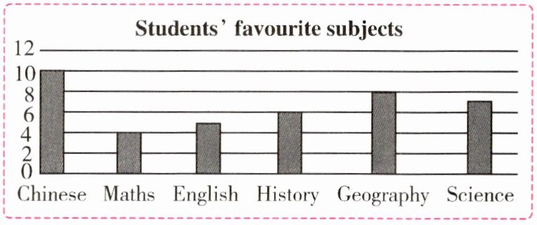 Hello, my name is David. I study in No. 5 Middle School. I'm in Class 2, Grade 7. Here is a survey(调查)about the favourite subjects and activities in my class.