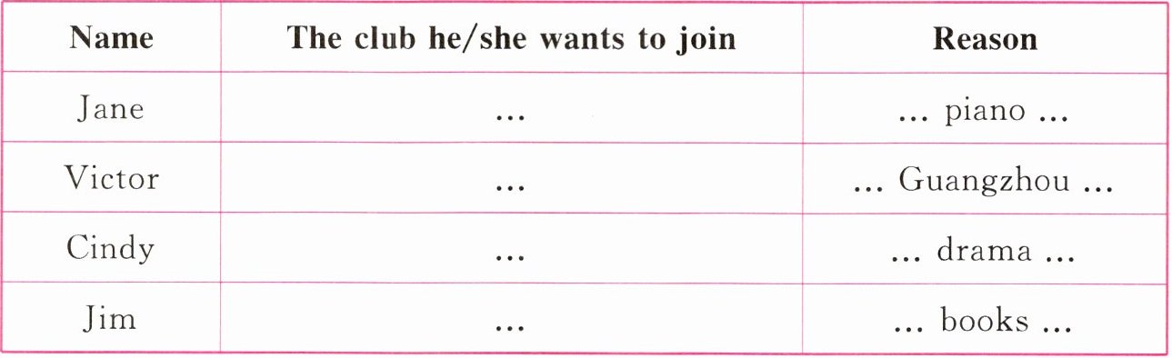 Many students in Jane's class want to join a club. Jane can play the piano,but she can't play it well. So she wants to join the music club to learn from others. Victor wants to go to Guangzhou,but he can't speak Chinese. So he wants to join the Chinese club to learn it. Cindy likes drama a lot. She can read with feeling. She wants to join the drama club. Jim can play basketball well. But his parents want him to read more books. So now he wants to join the book club.