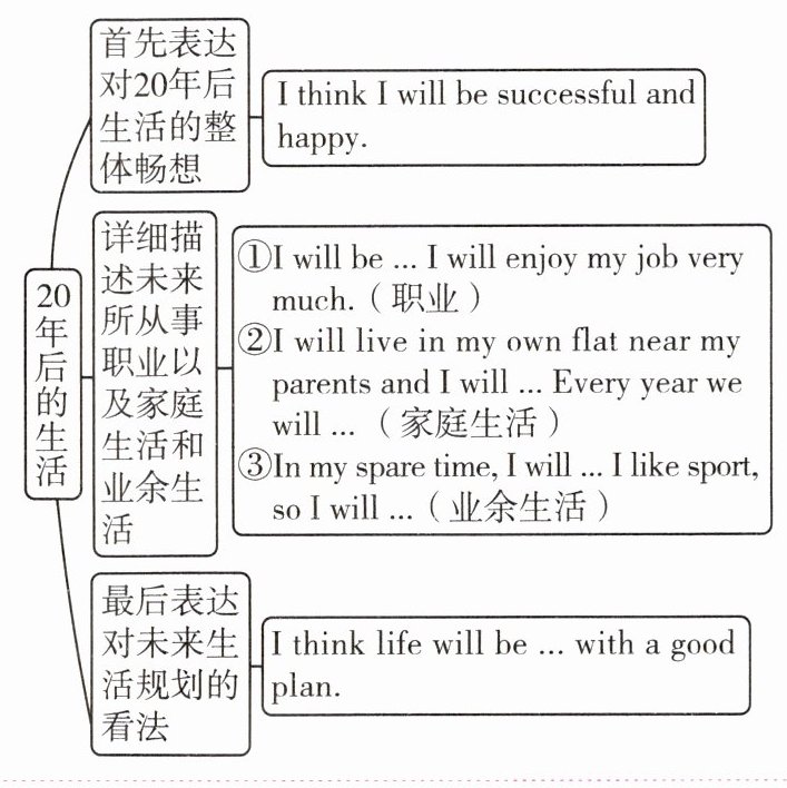 (1) 说明文;一般将来时;第一人称 One possible version: My Life in 20 Years Hello, everyone! What will my life be like in 20 years? Now let me tell you my predictions. In twenty years, I will be thirty-four years old. I think I will be successful and happy. I will be a businessman then and will set up my own website. I will enjoy my job very much. I will live in my own flat near my parents and I will visit them very often. Every year we will have a family trip. In my spare time, I will read books and travel around. I like sport, so I will also play football with my friends and go swimming. I think that’s what my future life will be like. I think life will be more meaningful with a good plan.