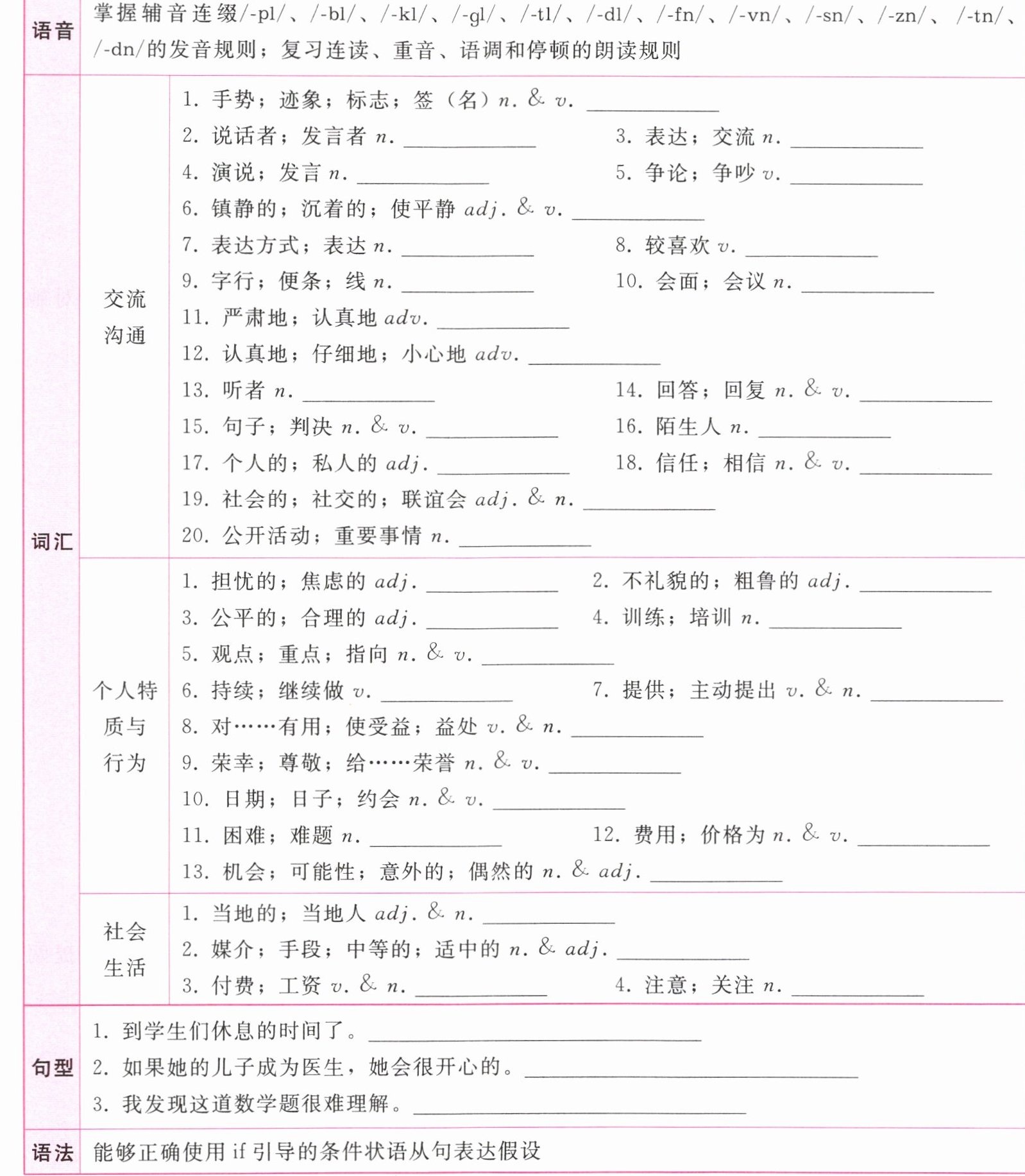 交流沟通1. sign 2. speaker 3. communication 4. speech 5. argue 6. calm 7. expression 8. prefer 9. line 10. meeting 11. seriously 12. carefully 13. listener 14. reply 15. sentence 16. stranger 17. personal 18. trust 19. social 20. event 个人特质与行为1. worried 2. impolite 3. fair 4. training 5. point 6. continue 7. offer 8. benefit 9. honor 10. date 11. difficulty 12. cost 13. chance 社会生活1. local 2. medium 3. pay 4. attention 句型1. It's time for students to have a rest. 2. If her son becomes a doctor, she will be very happy. 3. I find this math problem very difficult to understand.