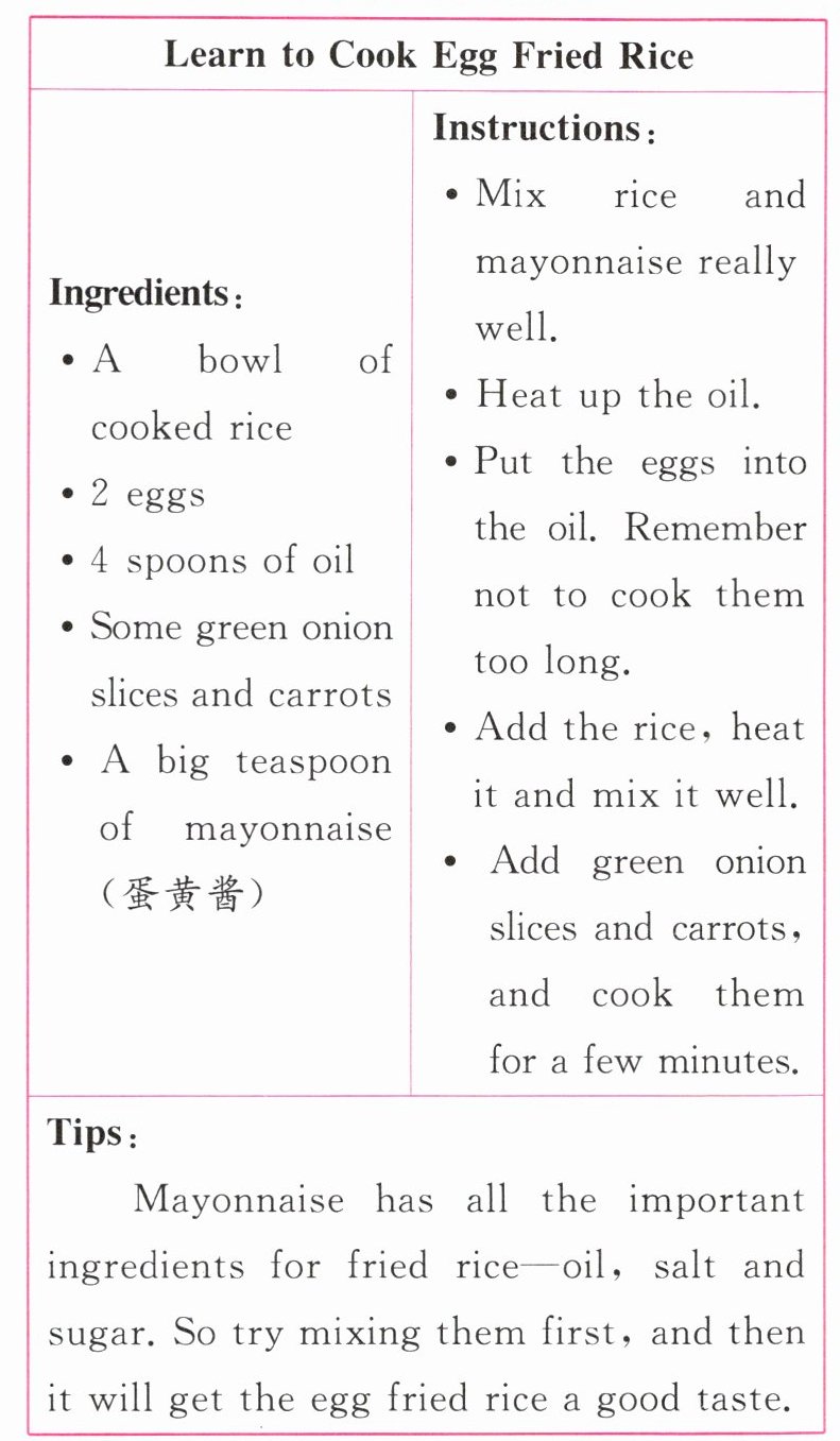 1. Which is NOT the ingredient for egg fried rice? (