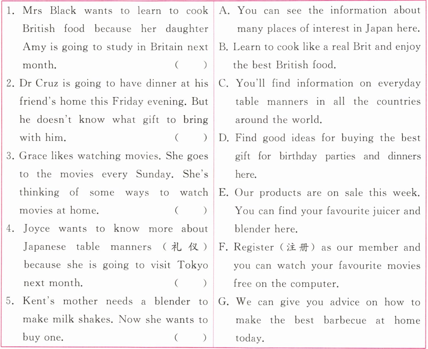 左栏是五个人的需求,右栏是七个网站的信息。请为每个人选择合适的网站。选项中有两项为多余项。