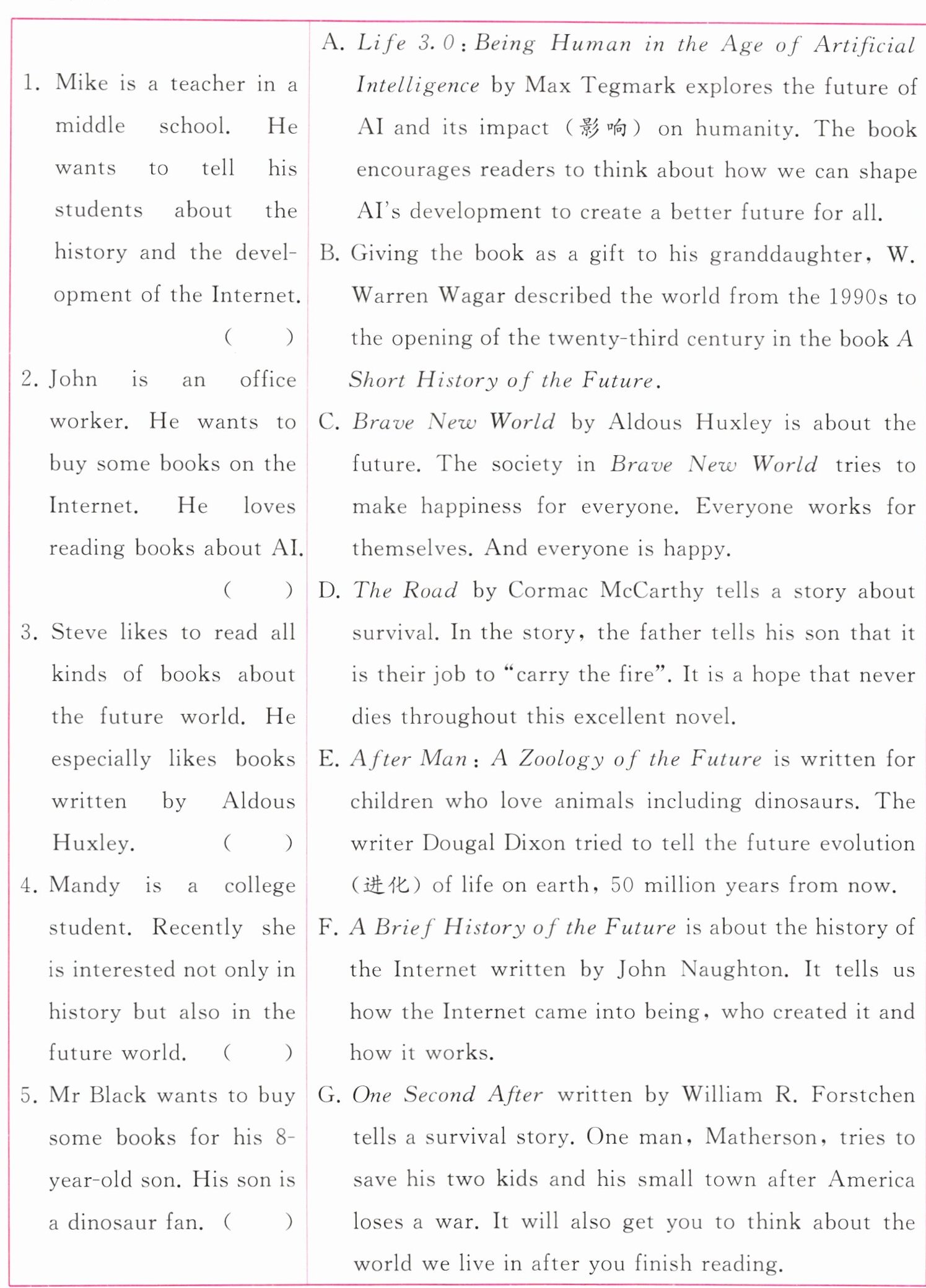 左栏是五个人的信息,右栏是七本书的介绍。请为每个人选择合适的书。选项中有两项为多余项。