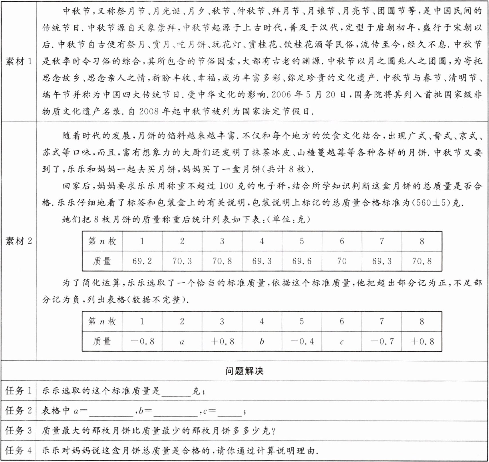 任务1:70 任务2:+0.3 -0.7 0 任务3:解:70.8-69.2=1.6(克).答:质量最大的那枚月饼比质量最少的那枚月饼多1.6克;任务4:解:69.2+70.3+70.8+69.3+69.6+70+69.3+70.8=559.3(克) 560+5=565(克),560-5=555(克),因为555<559.3<565,所以这盒月饼总质量是合格的.