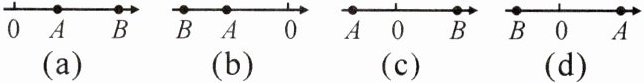 ② 当 $A$,$B$ 两点在原点的异侧时,如图(c)(d)所示,都可以得到 $|AB| = |b| + |a|$。