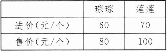 (1)设该玩具店购进“琮琮”x个,“莲莲”y个.根据题意得{x+y=100,60x+70y=6600,解方程组,得{x=40,y=60.答:该玩具店购进“琮琮”40个,“莲莲”60个;