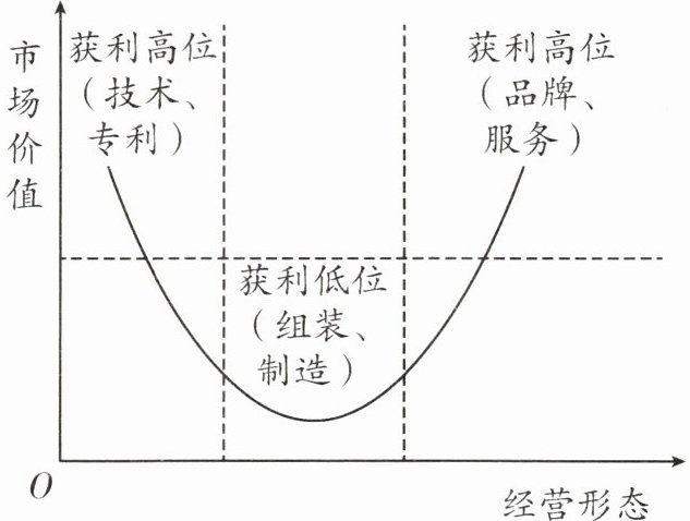 7. 如图所示,根据“微笑曲线”理论,附加值更多体现在两端,即研发设计和品牌营销,而处于中间环节的附加值相对较低。由此可知(