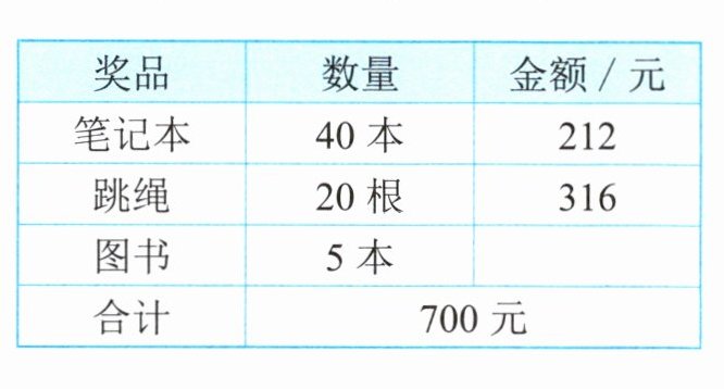 1. 体育老师为学校运动会采购奖品,请你算一算,买图书花费了多少元?并把表格补充完整。