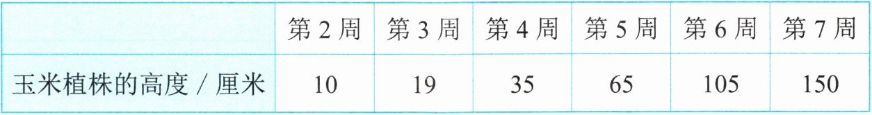 (1) 数学信息:第2周玉米植株高度10厘米,第3周19厘米,第4周35厘米,第5周65厘米,第6周105厘米,第7周150厘米。
