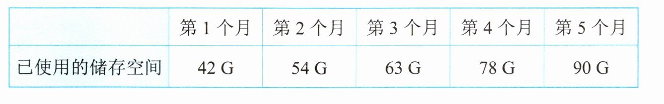 2. 笑笑妈妈买了一部手机,储存空间为$512G$,其中系统数据占$12G$。下表是笑笑记录的这部手机前$5$个月的储存空间使用情况(储存空间未清理)。妈妈前$3$个月分别使用了多少储存空间?