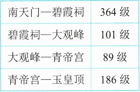 1. 泰山,位于山东泰安,是五岳之首,有“中华国山”“天下第一山”之美誉。右表是李叔叔记录的从南天门到玉皇顶各段走的台阶数。李叔叔从南天门到玉皇顶共走了多少级台阶?