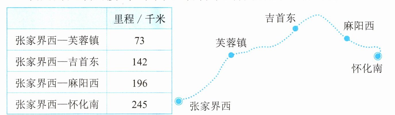 张家界西到怀化南的距离是$245$千米,张家界西到吉首东的距离是$142$千米。