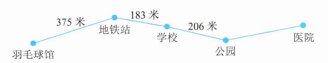 已知羽毛球馆到医院$998$米,羽毛球馆到地铁站$375$米,地铁站到学校$183$米,学校到公园$206$米。