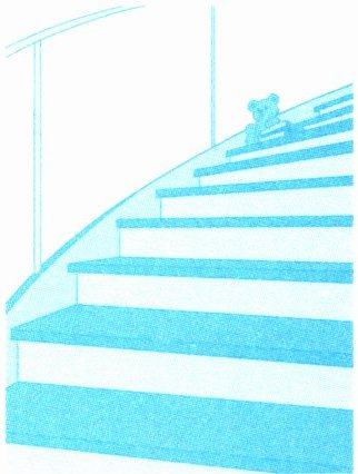 淘气正准备往上爬楼梯时,发现楼梯上放着玩偶和书。