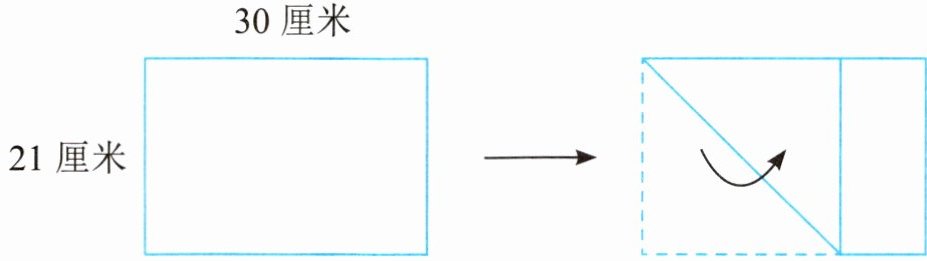 正方形的边长是21厘米,剩下的部分是一个长方形,长21厘米,宽9厘米,答案依次为21、长方、21、9 。