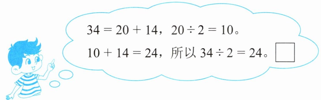 34 = 20 + 14 , 20 ÷ 2 = 10 。 10 + 14 = 24 ,所以 34 ÷ 2 = 24 。 □