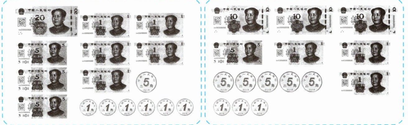 (3)淘气和笑笑征得父母同意后分别带了一些现金,准备购买心仪的物品。数一数,填一填,再比较它们的大小。