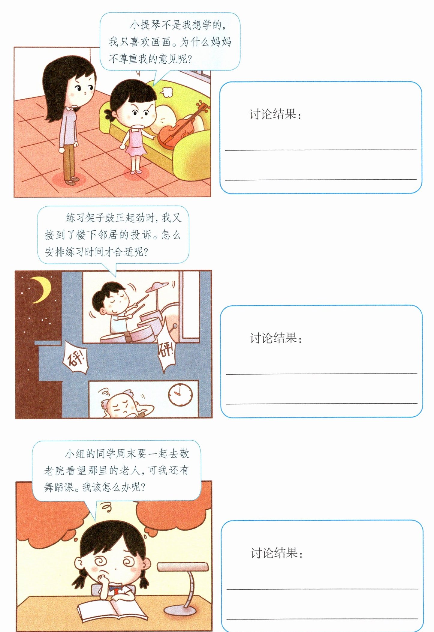 讨论结果:可以和妈妈好好沟通,表达自己对画画的热爱,同时说明自己也会合理安排时间学习小提琴,比如每周固定几天学习小提琴,其他时间画画,让妈妈看到自己的规划能力。